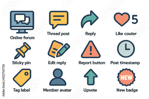 Forum icons set: threads, replies, likes, reports, and more