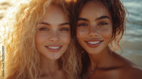 forward facing high quality image showcasing 2 women, one large size woman and one smaller size in Tshirt tan aesthetic,