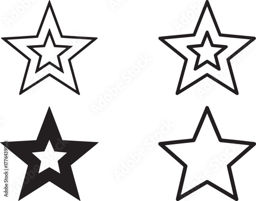 Four black and white star shapes with varying line thicknesses and orientations.