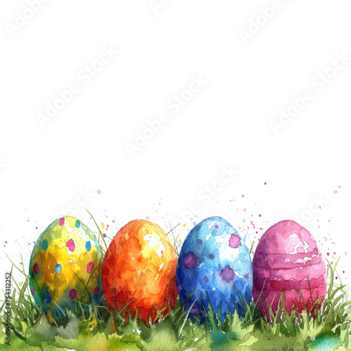 Four brightly colored Easter eggs nestled in vibrant green grass against a white background, space for text.
