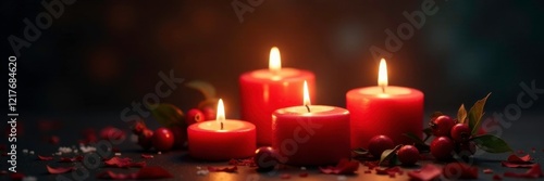 Four candles light up with warm glow on a dark background, advent, firelight, candles