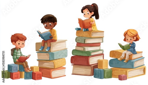 Four children, diverse in color, sit atop stacks of colorful books, reading