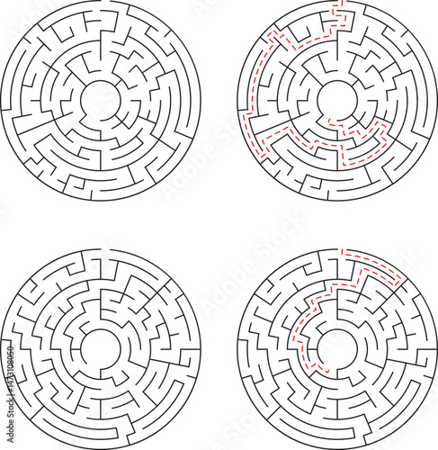 Four circular mazes with varying complexity featuring solved paths highlighted in red demonstrating solutions to the puzzles on a white background