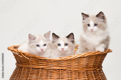 Four cute ragdoll kittens in a basket. Studio shot. Solid off white background.