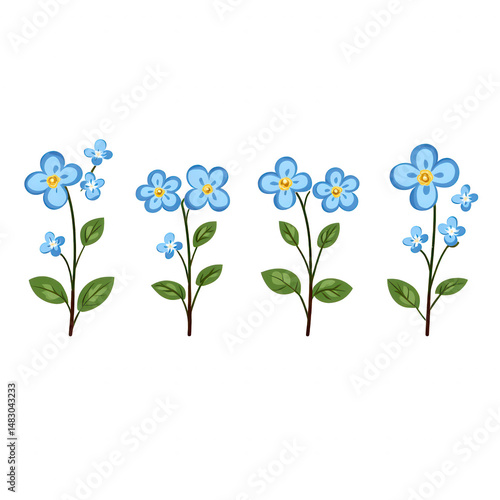 Four delicate blue flowers with green leaves, ideal for decorative purposes, isolated on a white background.