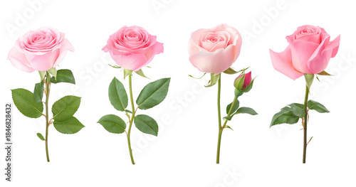 Four delicate pink roses with green stems and leaves isolated on a transparent background flower floral