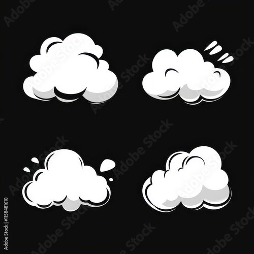 Four distinct cartoon-style clouds in white against a black background, showcasing various shapes and expressions.