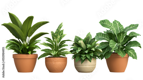 Four Distinct Potted Plants, A Showcase of Foliage and Textural Planters, Perfect for Interior Decor and Green Spaces Design, on a Minimalist Black Background,