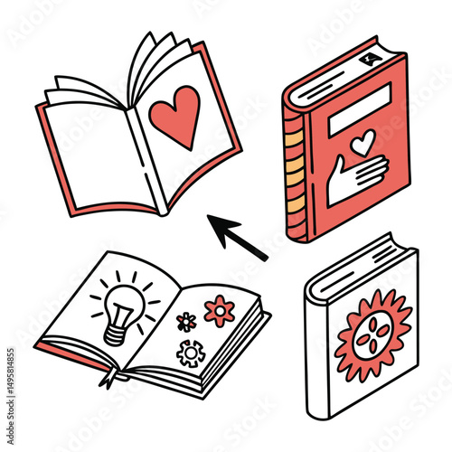 Four Illustrated Books Representing Love Knowledge Creativity and Innovation