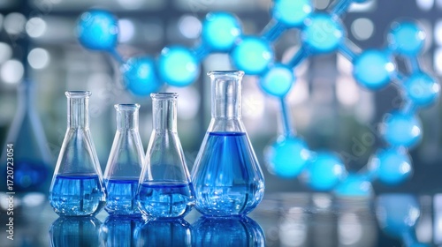 Four laboratory flasks with blue liquid in a laboratory setting.