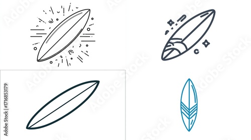 Four minimalist line art surfboards ready for summer vacation adventures by the ocean
