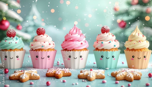 Four pastel Christmas cupcakes with frosting and sprinkles, accompanied by star-shaped cookies.