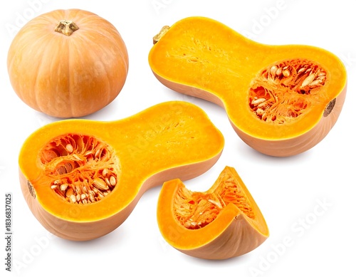 Four pieces of butternut squash, whole and sliced, on white background