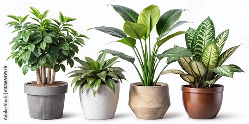 Four Potted Houseplants Isolated on White Background - Indoor Plants, Home Decor, Greenery, Minimalist Style, Natural Decor, Air Purifying Plants, Decorative Pots, Botanical Aesthetics