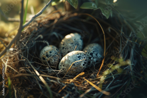 Four speckled eggs rest comfortably in a bird nest, surrounded by lush greenery, capturing a serene moment in nature during daylight