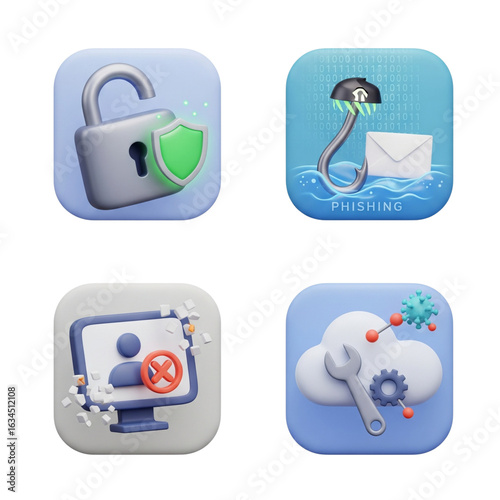 Four stylized digital icons representing security privacy communication and cloud technology