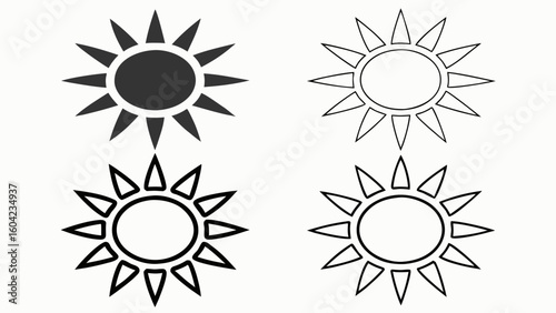 Four Sun Icons Variations Flat Minimalist Radial Rays Black Gray White