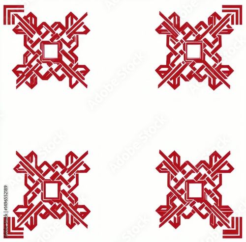 Four symmetrical red geometric patterns with interwoven lines and angular arrow shapes arranged on a white background