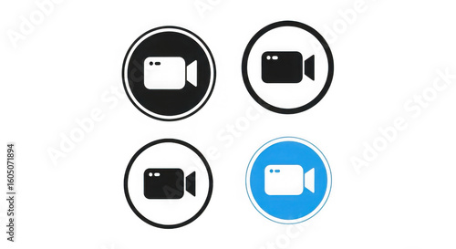 Four video camera icons in circular frames black white and blue minimalist designs for web and app interfaces isolated on transparent background
