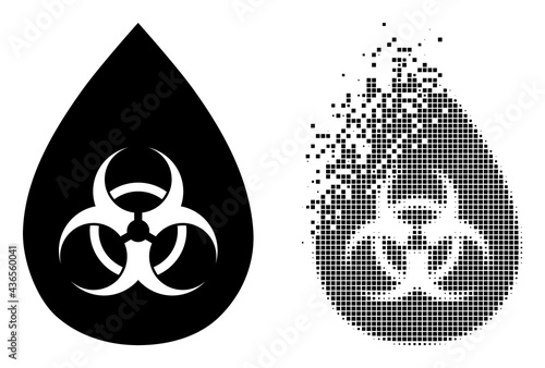 Fractured pixelated biohazard drop vector icon with destruction effect, and original vector image. Pixel destruction effect for biohazard drop shows speed and motion of cyberspace abstractions.