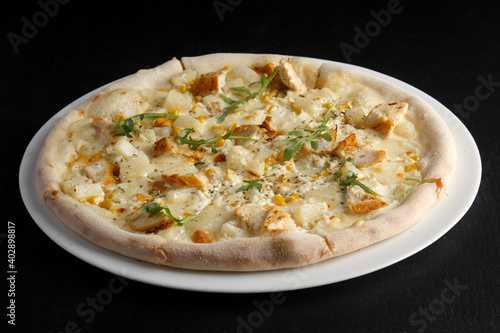 fragrant and hot pizza on a dark background