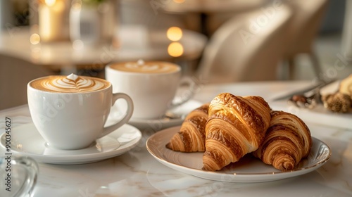 Fragrant latte in ceramic white cups and crispy fresh croissants on a marble white table