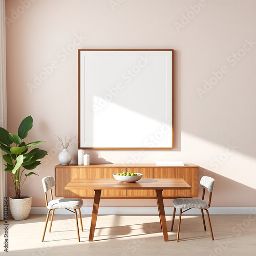 frame mockup for dining room wall art in pastel tones with mid-century modern style textured plaster wall above buffet 3d rendering landscape iso a2 interior design mockup digital art template decorat
