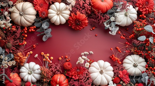 frame of white pumpkins fall decorations flowers on dark red table happy thanksgiving day autumn harvest concept flat lay top view copy space,stock photo