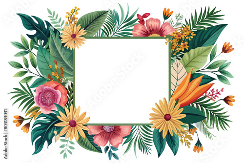 frame with some beautiful flower decoration and green leaves on white background. can be used as wedding invitation card.