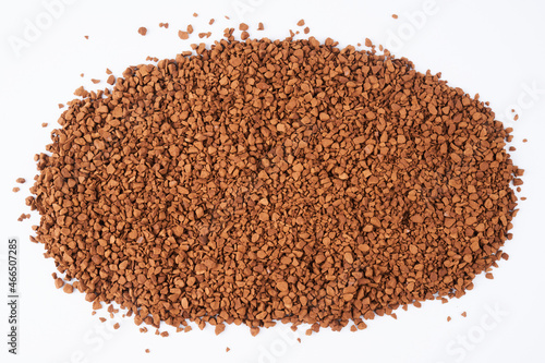 Freeze-dried instant coffee on white background close-up. Heap of powdered brown coffee product scattered on the table