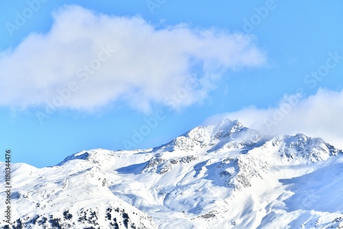 French alps on a sunny day under the clouds by winter covered with snow