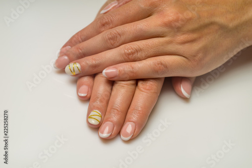 French manicure and nail gel Polish. The decoration of the nail white and gold decor. Top view Close-up photography