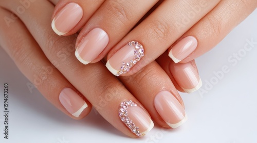 French Manicure Elegance | Pink & White Nail Art with Rhinestones for Beauty, Bridal & Salon Use
