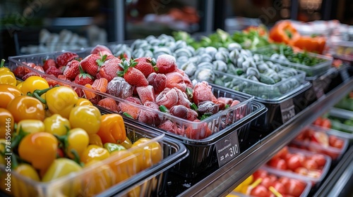 Fresh and frozen vegetables and meat in deli case at grocery store