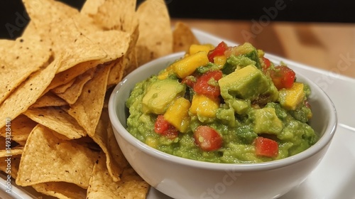 Fresh avocado and mango salsa, a vibrant and flavorful dip, served alongside crispy tortilla chips for a delightful snack.