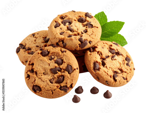 Fresh baked chocolate chip cookies with mint garnish isolated