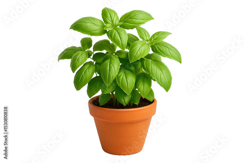 Fresh basil growing in a clay pot, showing green leaves, on transparent background for cooking or garden concept.