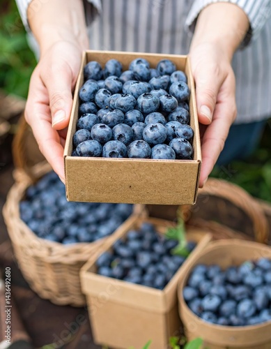 Fresh blueberries in cardboard box held by caucasian female, outdoor harvest scene
