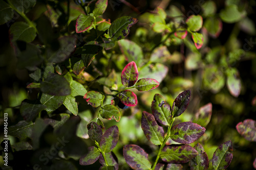 Fresh blueberry leaves in green and red colors. Nature patterns and texture background. Close-up of bilberry plants in harvesting season. Seasonal concept - autumn