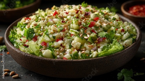 Fresh cauliflower salad with sunflower seeds and herbs in a bowl.