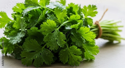 Fresh Cilantro Bunch - A vibrant bunch of fresh cilantro, glistening with dew, tied with twine. Perfect for culinary