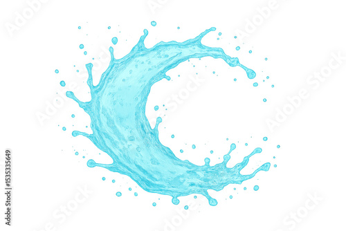 Fresh, clean, pure water forming a dynamic crescent shape, splashing with droplets on a transparent background