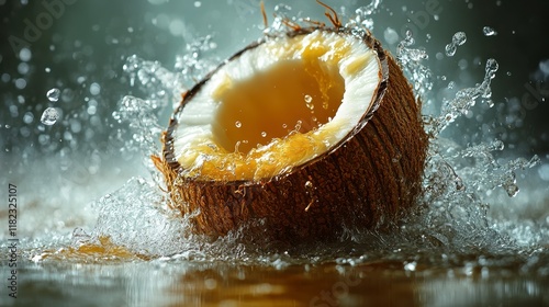 Fresh coconut splashing in water.
