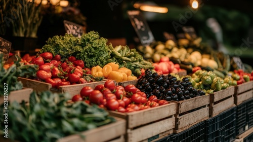 Fresh Colorful Vegetables and Fruits Displayed in Wooden Crates at an Outdoor Farmers Market Stand