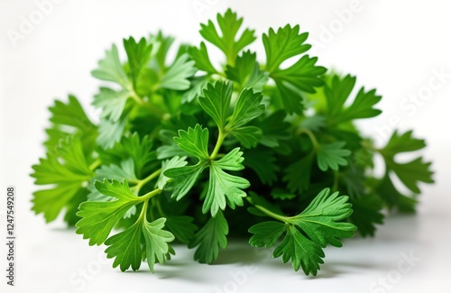 Fresh coriander bunch isolated on white background. Raw herb leaves. Aromatic, healthy ingredient. Culinary use. Versatile seasoning. Ideal for cooking. High quality image. Freshness emphasized.
