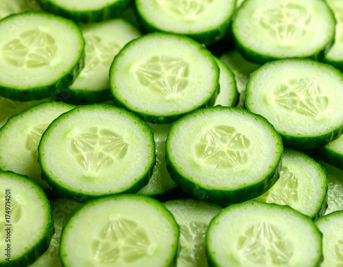 Fresh cucumber in white background, aesthetic and fokus slicing cucumber. Sliced cucumber showcasing its vibrant green and hydrating texture ideal for food photography, detox themes