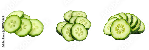 Fresh cucumber slices arranged in various stacks isolated on a transparent background highlighting their vibrant green color and distinct texture with visible seeds