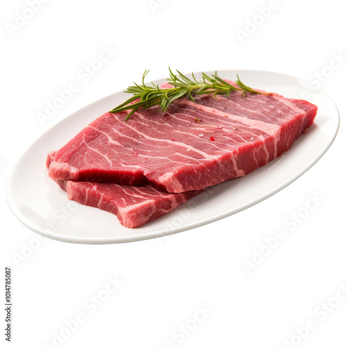 Fresh Cut Raw Beef Steak on Oval Plate with Herbs Garnish