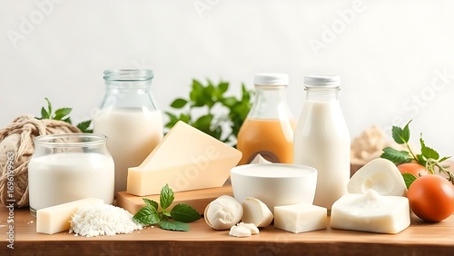 Fresh dairy products neatly arranged on a wooden table with soft natural lighting.