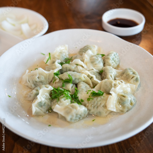 Fresh, delicious boiled garlic chives dumplings, jiaozi in white plate on wooden table background.